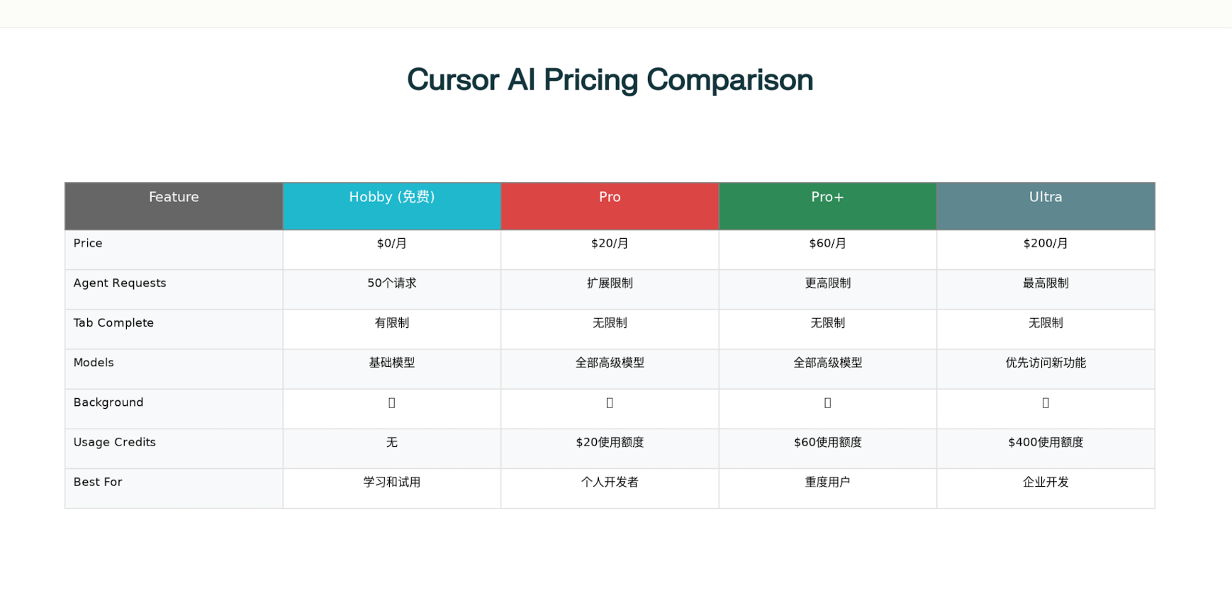 - **Pro($20/月)**:$20使用额度,无限Tab补全,后台Agent